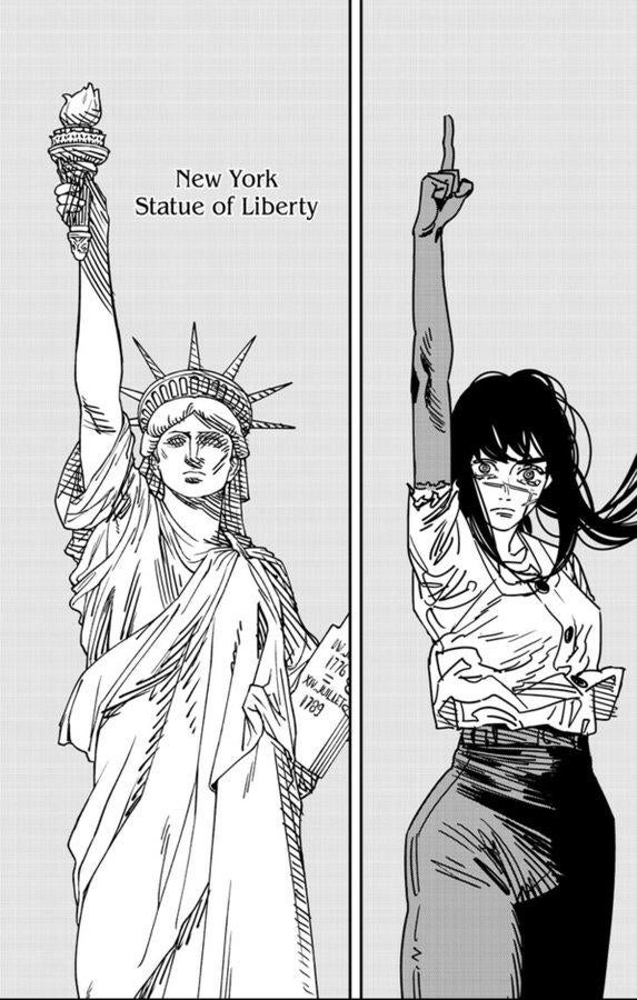 In the final pages of Chainsaw Man chapter 177, Yoru takes the blood sacrifice from the National Pistol Association and channels it. Her attack is compared to the Statue of Liberty as Yoru’s left arm is raised high. When she crooks her index finger, the face of the Statue of Liberty is seen cracking. There is no telling what her plan is, but clearly, it is borrowing power from the Gun Devil’s hold on the U.S. And if Yoru wants to argue that the nation is a product of war itself, well โ things are going to get messy for Denji very fast.