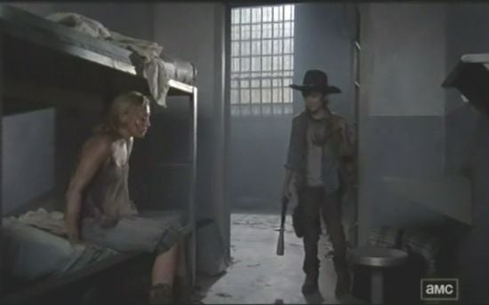 In an online bonus segment for The Talking Dead, producer Glenn Mazzara talked about the potential romances that have everyone buzzing about season 3 of The Walking Dead. In the season premiere, Carol appeared to be flirting with Daryl after he massaged her hurt shoulder.When a caller asked Glenn Mazzara if Daryl and Carol were going to get together, he said, “You’ll have to watch, but I think Carol would actually want that. We’ll see what happens, but what I like about that scene is that you see Carol so changed over the winter, that she can joke around. She’s kind of teasing him, giving him a hard time, and I think she’s kind of playful and stuff, flirty.”Host Chris Hardwick added, “What I think is kind of brilliant about it is that sometimes on shows you feel like they just had those two characters get together, because they were there, and they had to. But in my mind, he totally fits the profile of a dude that she would go after, kind of a little hard, emotionally unavailable, kind of pushes everyone away.”Mazzara then pointed out the potential issue of dating in a post-apocalyptic world if it doesn’t work out, as in the case of Rick and Lori. Hardwick joked, “It sucks so much to break up with someone, and now I’ve got to stay in the group, and see them all the time. It’s not like they can move across town.”While Rick’s relationship might be dying, his son Carl seems to be fairing better. One of the biggest stories out of The Walking Dead panel at New York Comic Con was when Chandler Riggs, who plays Carl, revealed that there might be something going on with his character and Beth, who is four years older. When Glen Mazzara was asked if Carl was in fact nursing a crush for an older woman, he said, “I believe he is. Yeah, it makes sense. She’s cute.”