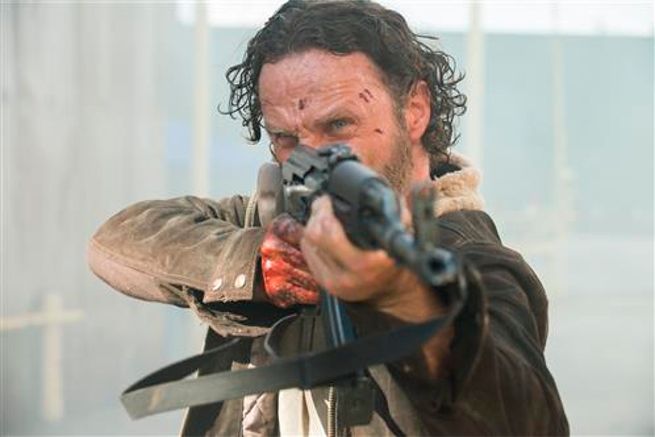 Outside, the Terminians are starting to make some headway against the walkers but it’s a bad scene for Rick’s group no matter where they look. Rick hides behind a car, watching a group of Terminians shooting off automatic weapons, and takes out the one at back, stealing his gun and mowing down the ones ahead of him. As walkers continue to move through the area, eating the injured, it clears up a path for Rick and company.