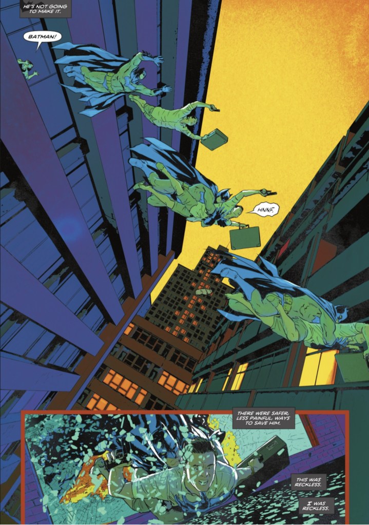 All too late, Batman realized that Toomey wasn’t kidnapped by Intergang but was working with them. He leapt after the fearless man, saving him by crash-landing in the building across the street. As he did, Batman realized that he didn’t consider the possibility of Toomey working with Intergang because he didn’t want to. He also had plenty of safer ways to save Toomey, but he took a risky, quicker alternative. He was getting reckless, fearless, and it was taking away everything that made him a great detective.