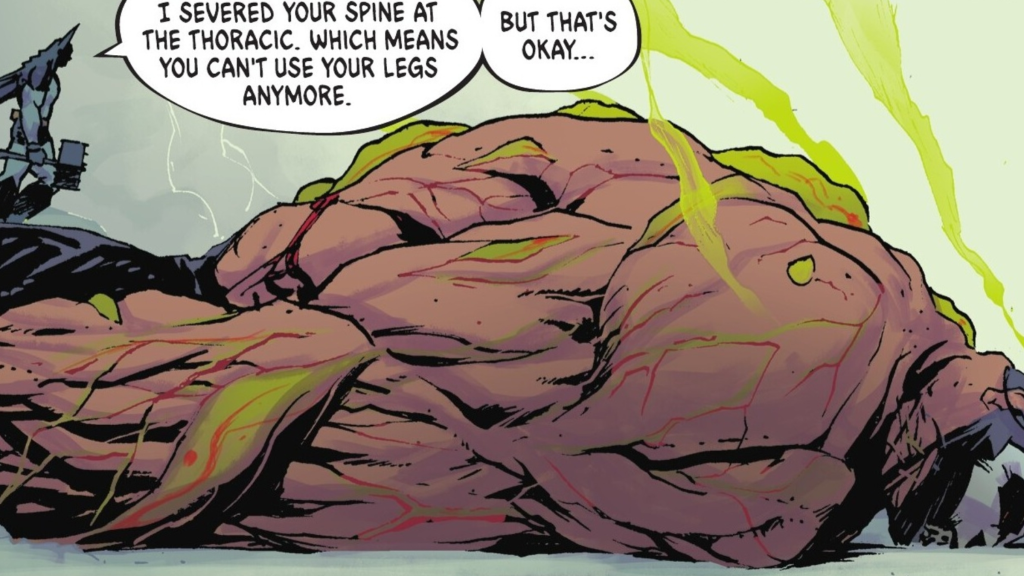 What I like so much about this issue is that it’s meant to parallel two previous losses Batman has suffered against Bane. Obviously, it mirrors Absolute Batman #9, when Batman and Bane first fought (right down to Batman mimicking many of Bane’s insults from that issue). But there are also similarities to the first fight between the Prime Universe Batman and Bane. Just as Bane broke Batman’s back, Absolute Batman destroys Bane’s back here. And while that’s only a small part of Bruce’s plan, the result is Absolute Batman achieving a victory that’s, frankly, shocking to see.