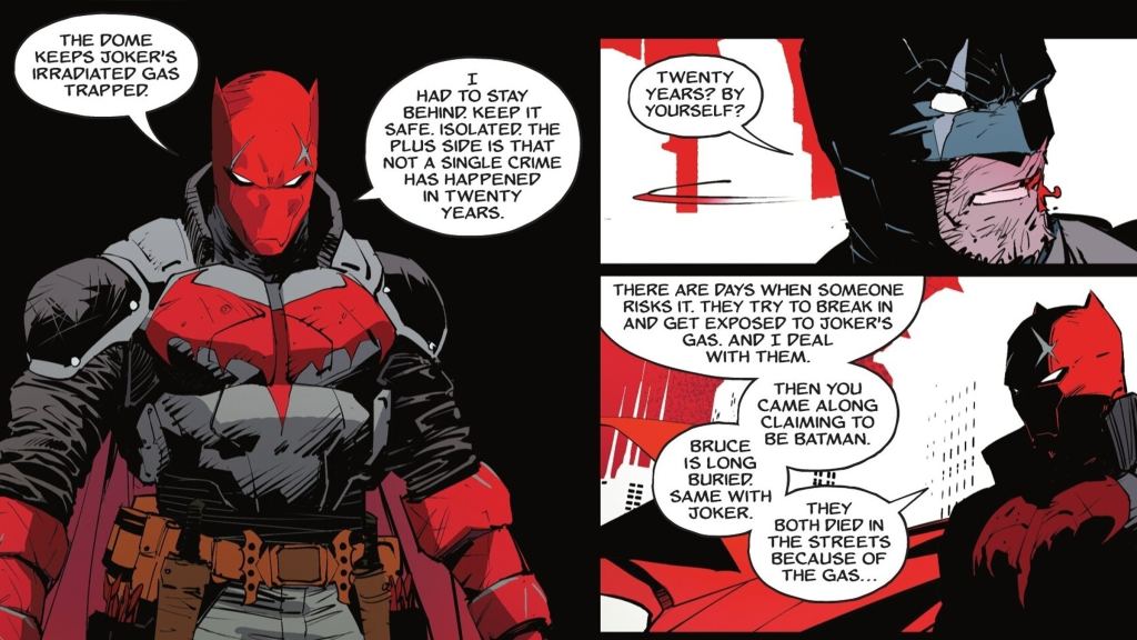 Jason explains to Batman that after a deadly gas attack by the Joker, Gotham had to be evacuated and sealed off. But Jason stayed behind, having learned how to be alone from Batman. For two decades, Jason has monitored Gotham, patrolling it for anyone foolish enough to try to break in and dealing with the result. Other than that, Jason has been in total isolation for the 20 years since Gotham was transformed, something that absolutely shocks Batman to his core.
