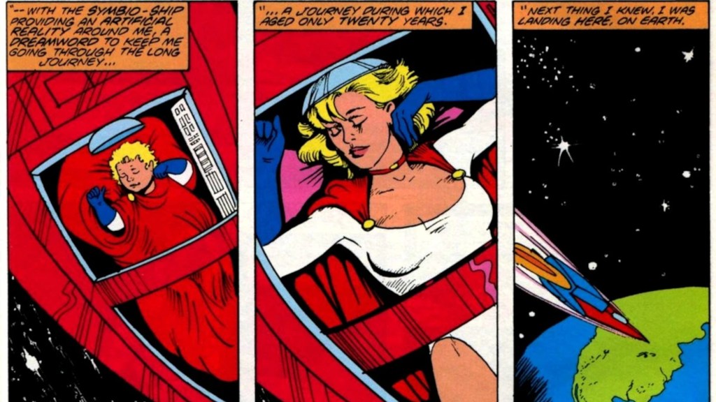 Much like her cousin, Power Girl was rocketed from the dying Krypton as a baby. However, while Clarkโs ship was outfitted for the fastest travel possible, Karaโs was a Symbioship, meant to keep her in stasis. The ship kept her in a dreamworld where she was raised by lifelike copies of her family for the next twenty years. By the time she finally arrived on Earth, she was a fully grown woman, ready to live alongside her heroic cousin. Earth-2โs Clark and Lois raised Power Girl like their own daughter, and she grew into a great hero in the Justice Society of America, but then the Great Crisis struck.