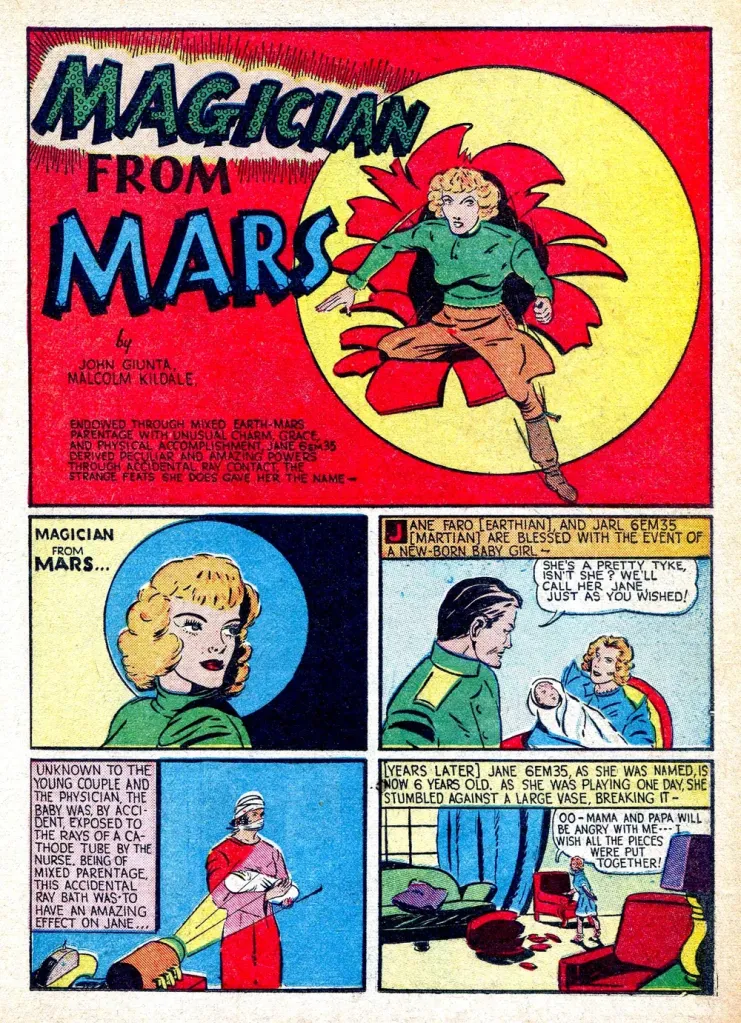 Much like the comic she appeared in, the Magician from Mars was not long for this world, only appearing in five issues, but that should not diminish her importance. Real name Jane 6ᴇᴍ35, renamed Jane Q-X3 in later installments, the Magician from Mars broke the door open for female-led comics where the ladies had all the power and had to save men, instead of being damsels in distress. Jane is actually a very interesting character, and since she was the first to ever wear the superherione title, she definitely deserves to be celebrated by taking a look at her adventures.