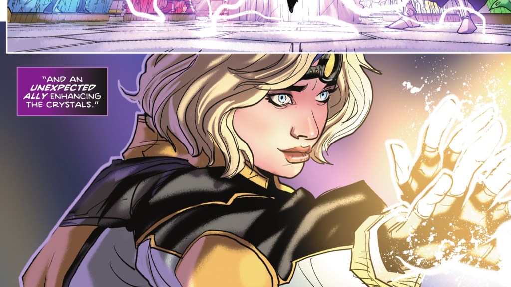 Back in the present, however, Terra has captured Nightwing and Raven. Sheโs stronger than ever, her geokinesis thriving among the minerals of Gemworld. The heroes refuse to fight Terra, who tries her damnedest to get them to retaliate. But Raven, who arguably has the most complicated relationship with Terra, tells her that goodness isnโt beyond her. They offer Terra a choice, saying that she can take complete control of Gemworld, ruling over Earthโs refugees, or she can start over, releasing everyone captured by Jinxโs attack on the world and showing everyone that she is, in fact, a hero.