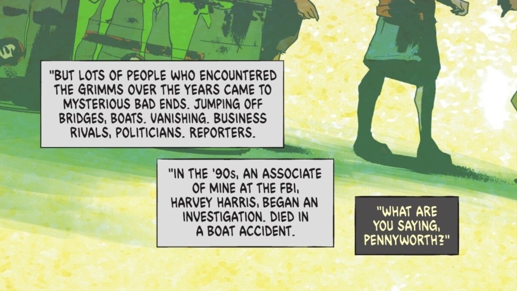 Alfred reveals that the Grimms aren’t what they seem and that they’ve been playing both sides of history and conning people for years. They’ve financed disasters and aid, enriching themselves. Worse, anyone who’s looked into them too closely has been disappeared or died under suspicious circumstances. Harvey Harris, an FBI associate of Alfred’s, was investigating them, only to end up dying in a boat accident. Alfred also reveals that he secretly believes that the Grimm family is a fabrication made up by Jack Grimm V, extending his life through some unknown means.