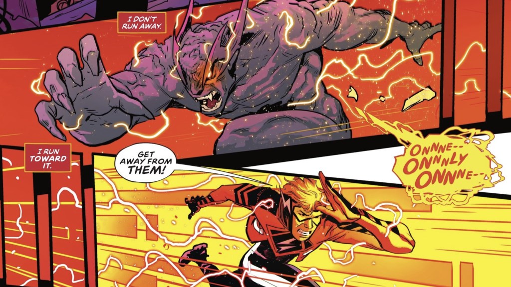 The final chapter in the Absolute Flashโs year one ends with Wally and the Rogues going up against the Reverse-Flash. At first, Wally is barely holding his own. Thawne was obsessed with wiping out Wally, screaming that there could only be one speedster. Wally gave his all to fight back, but Thawne was inspired by Darkseid and beat the Flash to a pulp with his much more destructive powers. Thankfully, the Rogues arrived and used Barryโs tech to rip open a portal back to the Still Point. Wallyโs dad said his goodbyes and tackled Thawne into the portal. With the tech destroyed, there was no way to reopen the portal or for the Reverse-Flash to escape.