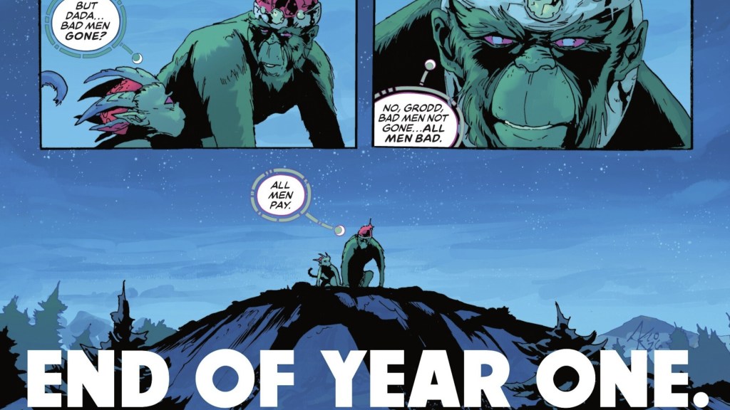 What nobody knew is that the adorable Grodd had found his father, another psychic primate. They reached a town, and when Grodd said that the bad men were gone, his dad replied that all men were bad and all men must pay. The main story of this issue was majorly rushed and failed to pay off the emotional beats it tried, but the ending and epilogues all provided an incredible setup for the future. The Reverse-Flashโs first appearance may not have reached its peak, but the next storylines are looking bright.