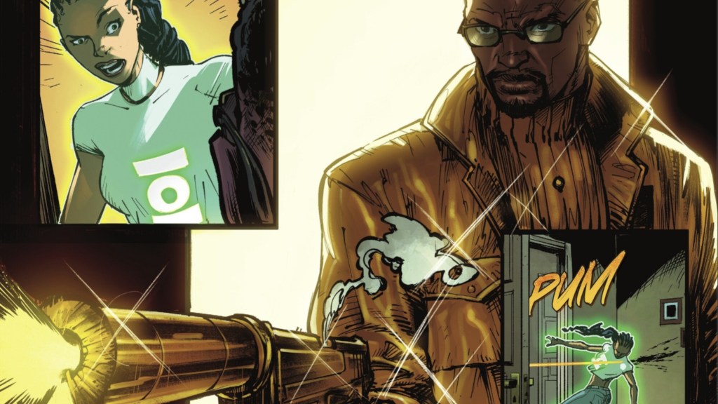 Absolute Green Lantern #9 kicks off with master assassin Keith Kenyon killing scientist Steven Dayton at the behest of Hector Hammond. Keith had a suit that emitted a special gas that allowed him to disguise himself as anyone, which he used to get inside Dayton’s home and secure the device that connected him to the same interstellar voice the Lanterns heard, warning about the face of Steel. After confirming Dayton’s death, Hammond immediately set Keith to work on getting rid of Jo Mullein, who was shacked up with a coma-ridden Hal Jordan and her ex-wife, Cameron Chase.
