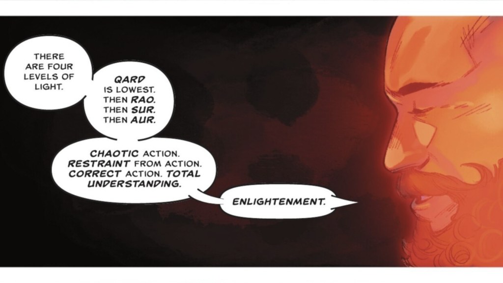 In the main universe, Green Lanterns are chosen because they are ready and worthy to fight the good fight. Jo, meanwhile, is a living chaotic action. She lacks the understanding that the Absolute Oans want their warriors to have, and will have to learn how to master her own light through an emotional journey to save the day from the forces of evil. Structuring the Emotional Spectrum this way perfectly ties with Jo’s backstory to force her to have character development to become a Green Lantern. It tied her having a character arc with mastery of her powers, and that is a phenomenal way to connect Jo’s character to the narrative.