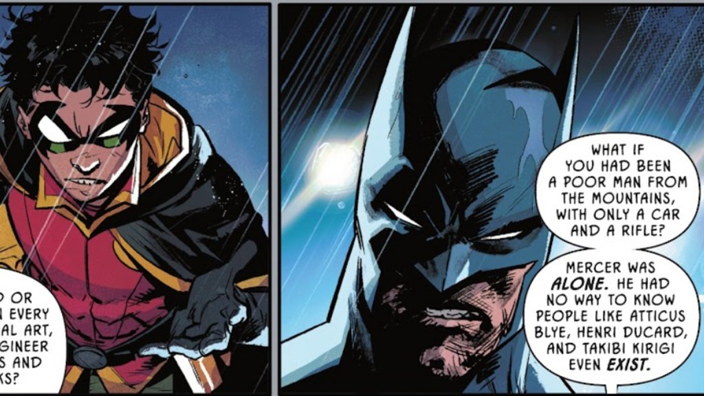 After leaving Blackgate, thereโs tension between Damian and Bruce. Batman still sees the Quiet Man as a murderer while Robin takes Mercerโs side. Batman pulls over and tells his son to say what he really wants to say. Robin points out that there are a lot of parallels between Mercer and Batman. Damian asks Batman to consider what would happen to a regular person who suffered through Bruceโs loss in Crime Alley, what would happen to someone who couldnโt travel and learn and turn themselves into something like Batman. Itโs hard words, but Batman thanks his son for his candor.