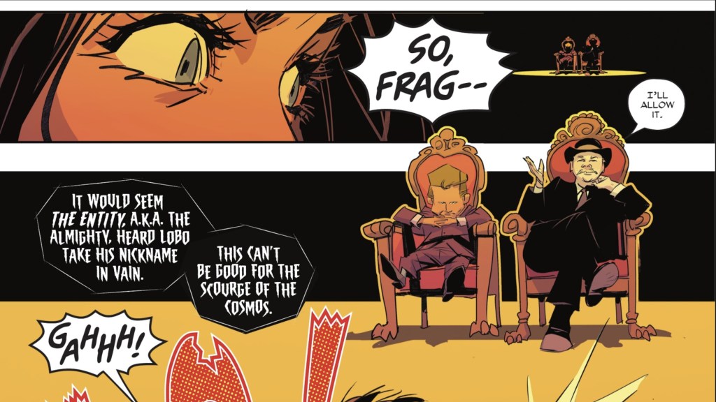 That, however, was the worst thing Lobo could have said. That โdamn Almightyโ had been watching this fight with great interest, and just when Lobo thought he had this fight in the bag, the Presence and Derek both appeared. Since Lobo took the Lordโs name in vain, he revoked Loboโs immortality, with Derek tearing up the memo. Without his immunity to death, Wonder Woman easily dispatched the Main Man in what will surely stand as one of the funniest and most-Lobo fights of all time. It just goes to show that when you have a gift like that, you could really stand to choose your words more carefully.