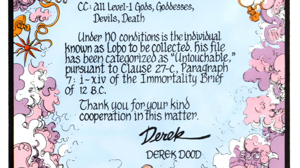Loboโs gift of immortality came from the four-part 1992 miniseries, Loboโs Back. The Main Man was short on cash and decided to take a bounty to face the notoriously dangerous outlaw, Loo. Unfortunately for Lobo, this job was set to be his last, as he was fatally blasted by Looโs deformed brother, Feces, who was in Looโs pocket. Lobo died and was taken to the Afterlife, where the problems started. Derek Dood is the administrator of the Afterlife and was tasked with deciding where souls should go after people die. His biggest challenge of all came when Lobo was jetizoned up to him.