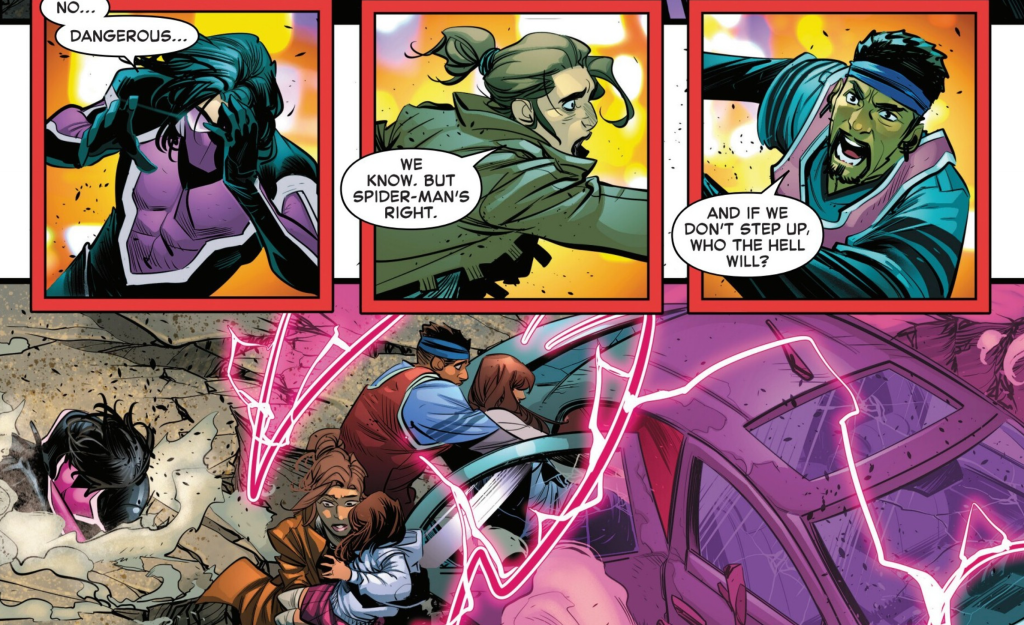 In an incredibly touching moment, the citizens of New York City are inspired by Spider-Man’s words and run headfirst into danger to help in Rapid’s rescue mission. They pull victims away from the sinkhole while Rapid desperately tries to keep his time-slowing field up. This is who Spider-Man is at his core. He is a man who can inspire everyday people into being better. Such an idea also relates to the number of Spider-themed heroes he’s influenced, like Miles Morales and Bailey Briggs, who follow in his footsteps and like Spiderman embrace the responsibility that comes with superpowers. After all, Peter himself was just a nobody who happened to be bitten by a radioactive spider. It’s what he does with those powers that makes him a hero.