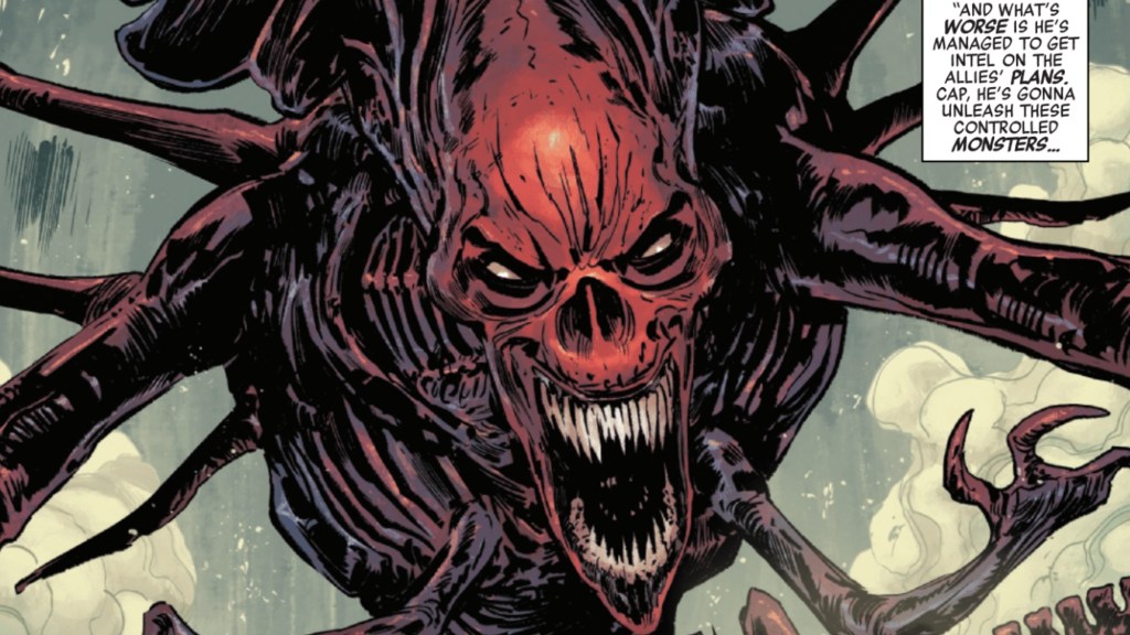 The battle clears, and Captain America’s side has won, though Marvel can’t help but feel something is off with how in sync the Xenomorphs were acting. As it turns out, there’s a reason for that. Fury reveals that this attack was a distraction for Red Skull’s true plan: Operation Red King. Red Skull is preparing to attack Normandy with an army of Xenomorphs. But the reason the aliens are acting much more obediently is that Red Skull has fused with the Alien Queen, transforming him into a nightmarish monster with all the powers of the top-tier Xenomorph.
