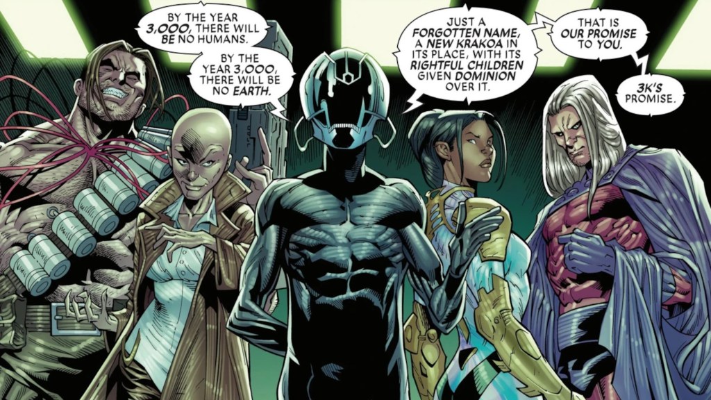 For the entire From the Ashes era, Cyclops’s X-Men team has battled the organization known as 3K, whose goal was to forcibly transform humans into mutants and wipe out humanity by the year 3000. The enigmatic chairman recruited several of the X-Men’s most dangerous enemies from over the years, including Wyre, Astra, and Cassandra Nova. They call themselves the true heirs of Krakoa, and genuinely believe they have mutantkind’s best interests at heart. The Chairman has also shown a distinct interest in clone Beast, trying to recruit him. The Chairman clearly knows the X-Men well, is a brilliant genetic scientist, and believes he’s doing the right thing for all mutants.