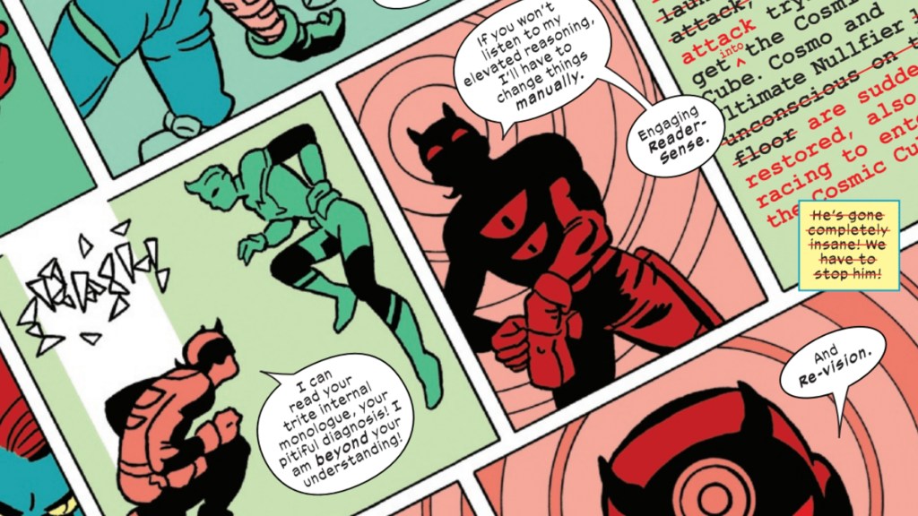 Ultimate Daredevil uses a hyper-cube to contain elements of the universe and the Guardians work hard to stop him. But it’s hard, as Daredevil’s extra-dimensional power allows him to utilize the negative space of the comic page itself. He can reshape panels, travel from one box to another, and even possesses ‘reader-sense’, which enables him to change the script of the comic and get his friends to back down. But despite the immense power at his fingertips, Captain Marvel manages to grab the hyper-cube and restore everything Daredevil plucked from the universe.