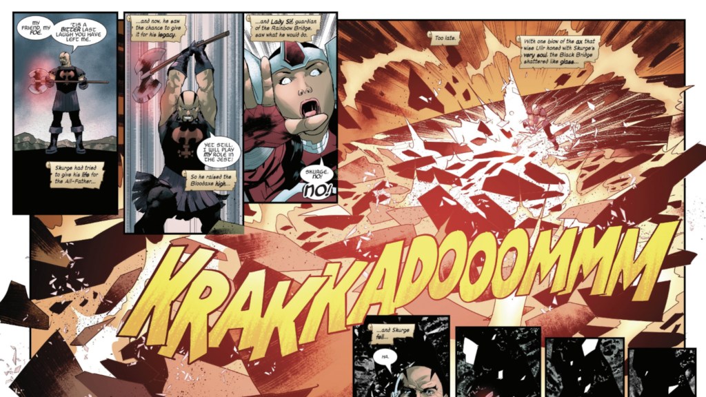 Far later, Skurge would be revived, and he would become obsessed with shouldering Thorโs death once again. He got his wish in Immortal Thor #25, where Skurge shattered the Black Bridge to keep the forces of Utgard from ravaging the realms, tumbling into the endless abyss beneath. Skurge twice gave his life in the same way and proved himself a hero twice over. Heโs the greatest bridge-holder there shall ever be.