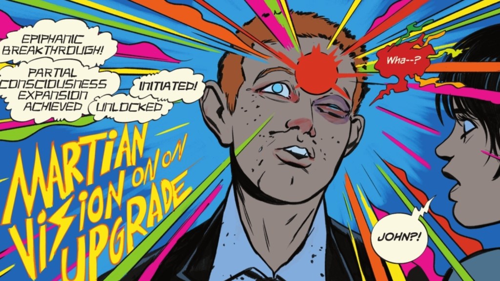 I knew this book was going to be special from the very first issue, which was hyped up with a gimmick one could only enjoy with a physical copy. Indeed, the creative team designed arguably the series’ most iconic moment when they showcased the Martian’s power, ‘Martian Vision’, allowing readers to see the Martian was occupying Jones’ body by holding a page up to a light source to see both sides at once. This book has repeated this trick a few times, and it really showcases the experimental nature of this incredibly trippy book.