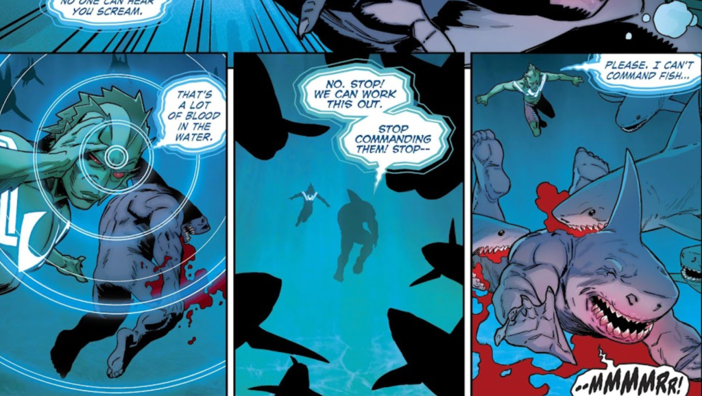 Not to be confused with the longtime Suicide Squad member King Shark, Karshon, aka the Shark, is a lesser-known Green Lantern villain. When the freedom fighter/terrorist team, the Revolutionaries, attacked a nuclear submarine, the Squad was sent to apprehend them. The Shark ate one of the Revolutionaries named Scale, in front of his brother, Fin. Once defeated, the Revolutionaries were forced to join the Suicide Squad. However, this proved to be the Sharkโ€™s undoing. During a later mission, Fin and he were sent on a mission to infiltrate an enemy base underwater. As payback for Scaleโ€™s death, Fin stabbed the Shark, drawing blood, and then used his telepathy to encourage a swarm of sharks to devour the cannibalistic supervillain in a feeding frenzy.