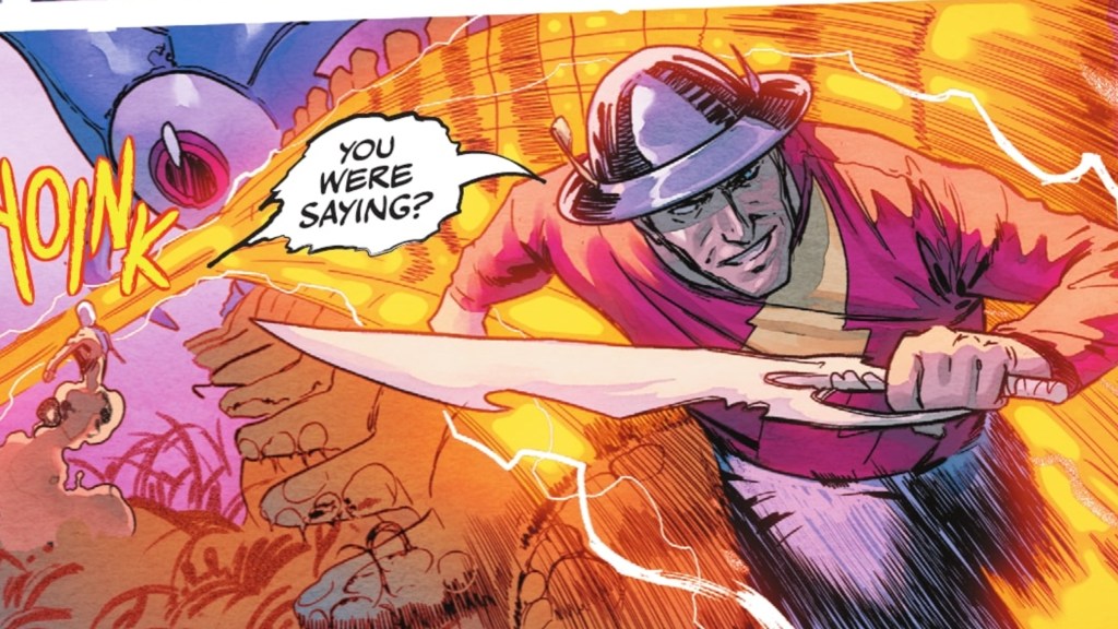 The Flash of this tournament might not be a young buck like Wally West, but Jay Garrick showed that heโs still got a fire in his belly. Midway through DC K.O. #2, a fight breaks out for the God Killer Sword (which, yes, can do exactly what its name implies). As Metamorpho, Plastic Man, and Starro all battle for the blade, the Flash sneaks in and steals it for himself. We donโt get to see him use it much, but the God Killer Sword is powerful and paired with Garrickโs speed, it makes him a legit threat.