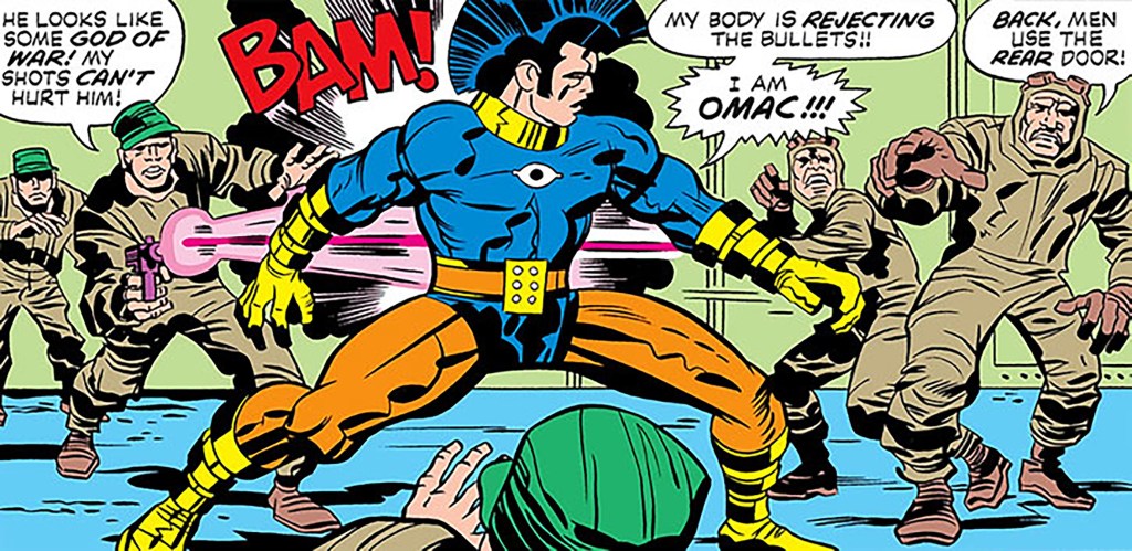 Jack Kirbyโs O.M.A.C. is a seriously cool comic. The series centers around Buddy Blank, aka the One-Man Army Corps and is set in a dystopian future where people are pushed to violence to relive stress. As O.M.A.C., Buddy is charged with the Global Peace Agency to stop power hungry millionaires trying to exploit the less fortunate. Itโs a very โKirbyโ book โ itโs also the book that gives us Brother Eye, a sentient satellite.