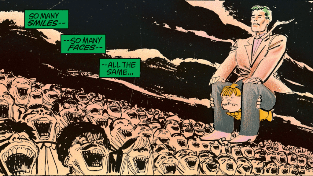 After Batman retired, the Joker entered a catatonic state and was treated by Dr. Wolper, who believed that the villain was a victim of the Dark Knight. When Batman returns, the Joker recovers and preys on his psychiatrist’s mistaken beliefs. The Joker and Dr. Wolper were invited onto a late-night show to demonstrate the Joker’s rehabilitation. Of course, it goes horribly wrong. First, the Joker poisons his psychiatrist with a Joker Venom-laced kiss and then has two flying dolls fill the studio with a deadly gas. Everyone, aside from the Joker, dies horribly with their faces forcefully contorted into horrific grins. It was a message to the entire world: The Joker was back. This haunting moment also likely inspired the iconic talk show scene in the 2019 Joker film.