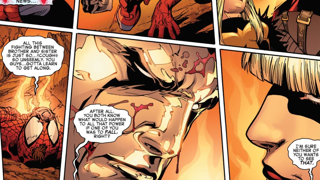 Not all victories in a fight come from actually throwing a punch. In Avengers vs. X-Men #9, Spider-Man is actually facing an incredible uphill battle by fighting the brother-sister pair Colossus and Magik. Peter is brutally taken down by the siblings to the point where even his narration boxes are bleeding. But Peter manages to use a few sly words and manipulates Magik and Colossus into attacking one another. Itโs not pretty, and Peter is severely injured, but out of the three, heโs the only one to walk away from the fight.