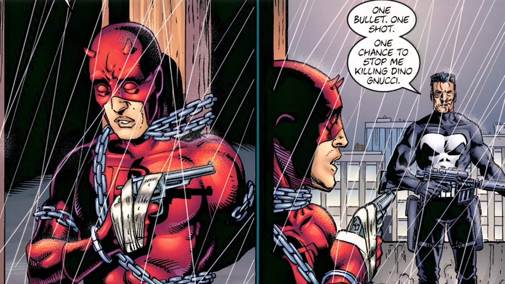 The Punisher and Daredevil have one of the most intense superhero feuds in comics, and theyโll frequently switch between being allies and enemies. The Punisher #3 has the titular anti-hero challenge Daredevilโs moral code. When the Punisher is hunting a notorious gangster, Daredevil arrives to stop him. However, the anti-hero manages to subdue Daredevil by using loudspeakers to exploit his weakness to sound. Upon waking up, Daredevil finds himself tied up with a gun in his hand. The Punisher gives the hero a sadistic ultimatum: shoot and kill him to save the gangster or let him murder the gangster. Ultimately, Daredevil decides to pull the trigger, but discovers that the gun has no bullets. After forcing the hero to break his code, the Punisher kills the gangster.