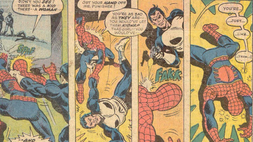 The Punisher made his first appearance as an antagonist of Spider-Man. Over the years, the Wall-Crawlerโs idealistic nature has clashed with the anti-heroโs blood-soaked campaign against crime. This has led to them fighting each other numerous times. In Giant-Sized Spider-Man #4, Spider-Man helps the Punisher fight kidnappers. However, Spider-Man becomes enraged when he learns that the Punisher would have allowed a kidnapped woman to die to obtain a lead on finding some terrorists. Spider-Man used his superior strength and agility to throw the Punisher around before the anti-hero managed to knock him out with a tranquilizer gun. When Spider-Man wakes up several hours later, he teams up with the Punisher to stop the terrorists.