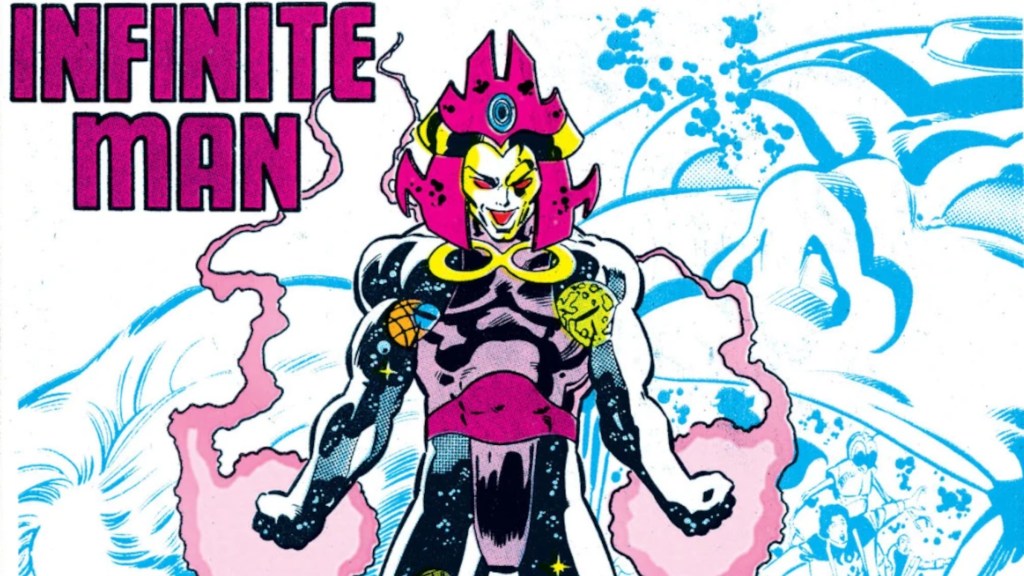 Jaxon Rugarth was originally a scientist of the 31st Century. He tested a new time machine meant to prove that the fourth dimension was circular, which inadvertently sent him through the entirety of time and infused him with chrono energy. He emerged with a broken mind and total mastery over time, which he used to battle the Legion of Super-Heroes. Despite their immense powers, including those of Superboy, they were unable to defeat Infinite Man and had to settle for trapping him. He could send anyone or anything to any point in time, and Infinite Manโ€™s intimate knowledge of every part of the timeline, coupled with his utter insanity, made him infinitely dangerous.ย