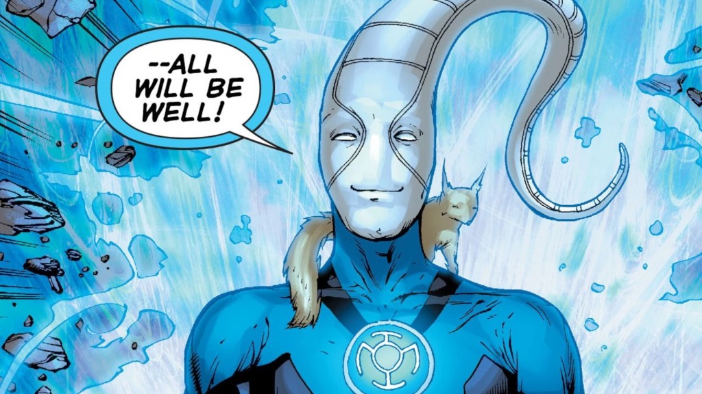 Saint Walker is the original and greatest of the Blue Lanterns. He is, welly and truly, the most hopeful being alive. No matter how dark or dangerous, Saint Walker will always hold onto his belief that all will be well. Even when he stood on the mountaintop of his dying homeworld, his family dead and feeling shunned by his god, he chose to hope, and in doing so, found a way to save everyone. His origin, detailed in Blackest Night: Tales of the Corps #1, detailed his endless struggle to hope in spite of everything. He does not ignore reality, but looks at it and sees a better future. Saint Walker is incorruptible and simply chooses to believe that things will have a happy ending.