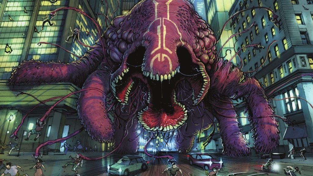 In the Absolute Universe, Superman has finally taken care of Raโs al Ghul. But his troubles are far from over. Avenging her father, Talia al Ghul interrupted the governmentโs seizure of Lazarus Corpsโ experiments by having a Peacemaker agent shoot at a specific container. This container held โProject: Parasiteโ and transformed an unsuspecting man into this worldโs version of the classic Superman foe. Now heโs a giant kaiju with fleshy masses and extra mouths terrorizing Metropolis with no one to stop him but the unlikely duo of Hawkman and Superman. No idea whatโs happening next, but I canโt wait.