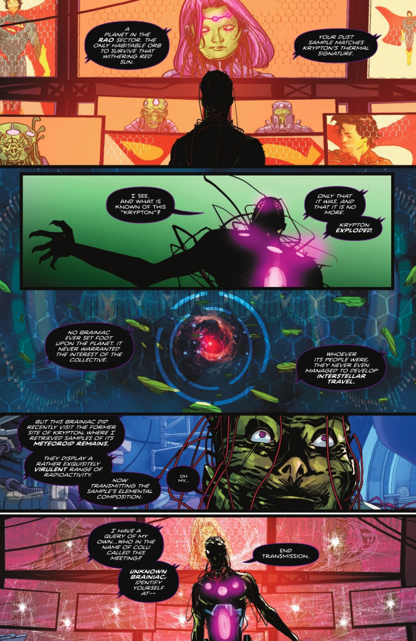 This started out with Brainiac making a call to the Collective, where he asked for any and all possible leads related to Superman’s identity and planet of origin. Most of the Collective either balked at the request or didn’t know anything, but one member matched the red dust sample to Krypton’s thermal signature.