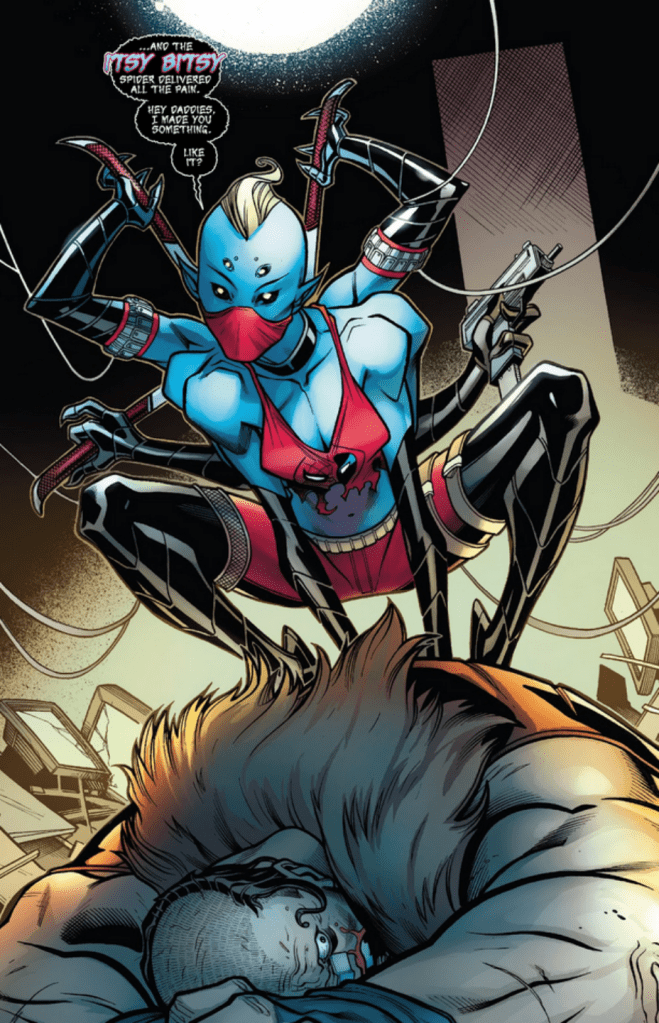 One of these “Manstrosities” wasn’t a man, but Spider-Man and Deadpool’s “daughter”: the blue-skinned, six-armed Itsy Bitsy, who introduced herself to her “daddies” with a twist on the nursery rhyme (“and the itsy bitsy spider delivered all the pain”).