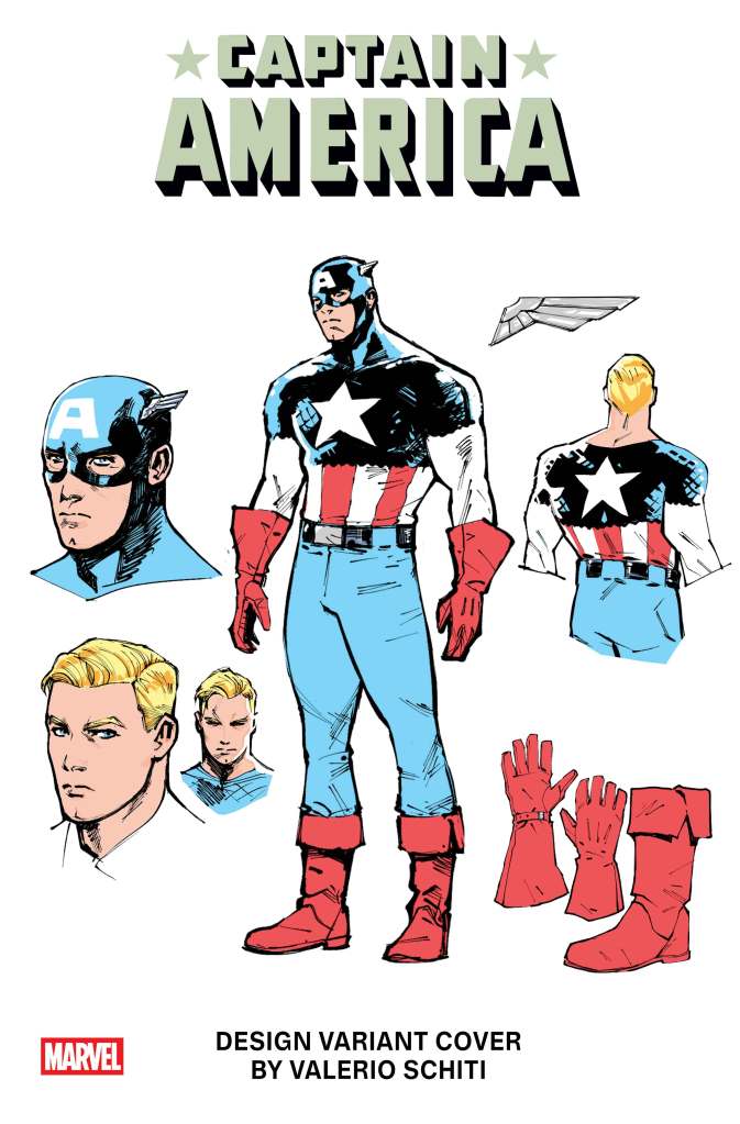 The main cover for July’s Captain America #1 is by Ben Harvey, with variant covers by series artist Valerio Schiti, who also contributes a Design Variant Cover showcasing Capโs new suit, along with superstar artists Frank Miller and Pablo Villalobos. Series writer Chip Zdarsky also shows off his artistic chops with his own variant cover.