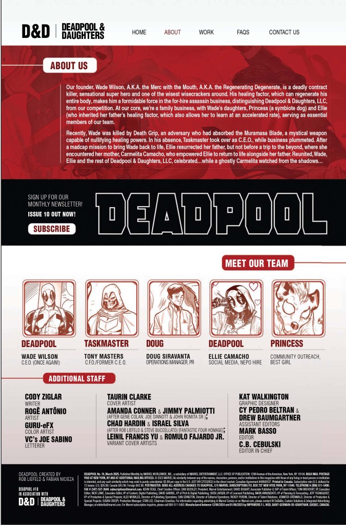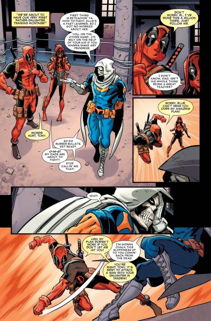 “HE’S BAAAA-AAAACK! THE RETURN OF WADE WILSON! DEADPOOL is in the house!” the solicitation for Deadpool #10 reads. “And so is, uh, the new DEADPOOL! But WADE’s resurrection has come with a cost, and if WADE and ELLIE can’t cope, this may just spell the dissolution of Deadpool & Daughters! A new jumping-on point as an all-new chapter begins here!”