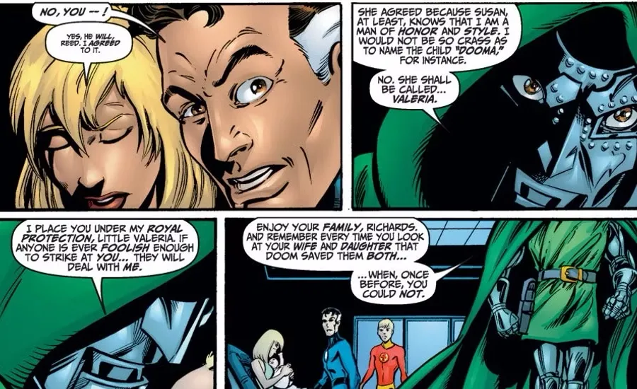 When Reed Richards is held up while on an adventure, Johnny Storm has to find help for his sister as she slides into labor with her second child. He goes and fetches Doom, who comes to the rescue, aids Susan Storm, and delivers the healthy baby while only asking for one thing in return: He wants to name the child, opting for Valeria. Reed Richards arrives just too late and objects, but the deed is done. Doom goes on to have a close, loving relationship with his goddaughter. It might be the sweetest thing Doctor Doom has ever done.