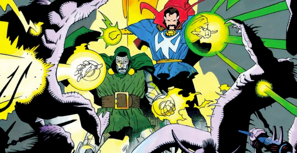 Arguably, the greatest Doctor Doom team-up comes in this tale with Doctor Strange, where Doom has earned the right to request Strange’s mystic help during a gathering of the sorcerers ordered by the Aged Ghengis. This is the story where Strange officially becomes the Sorcerer Supreme after the Ancient One’s demise, and his first act is an obligation to grant a wish. Doom gets that request and asks for Strange’s help to finally free his mother from hell. What follows is a battle between Doom and Strange with Mephisto right in the heart of Hell.