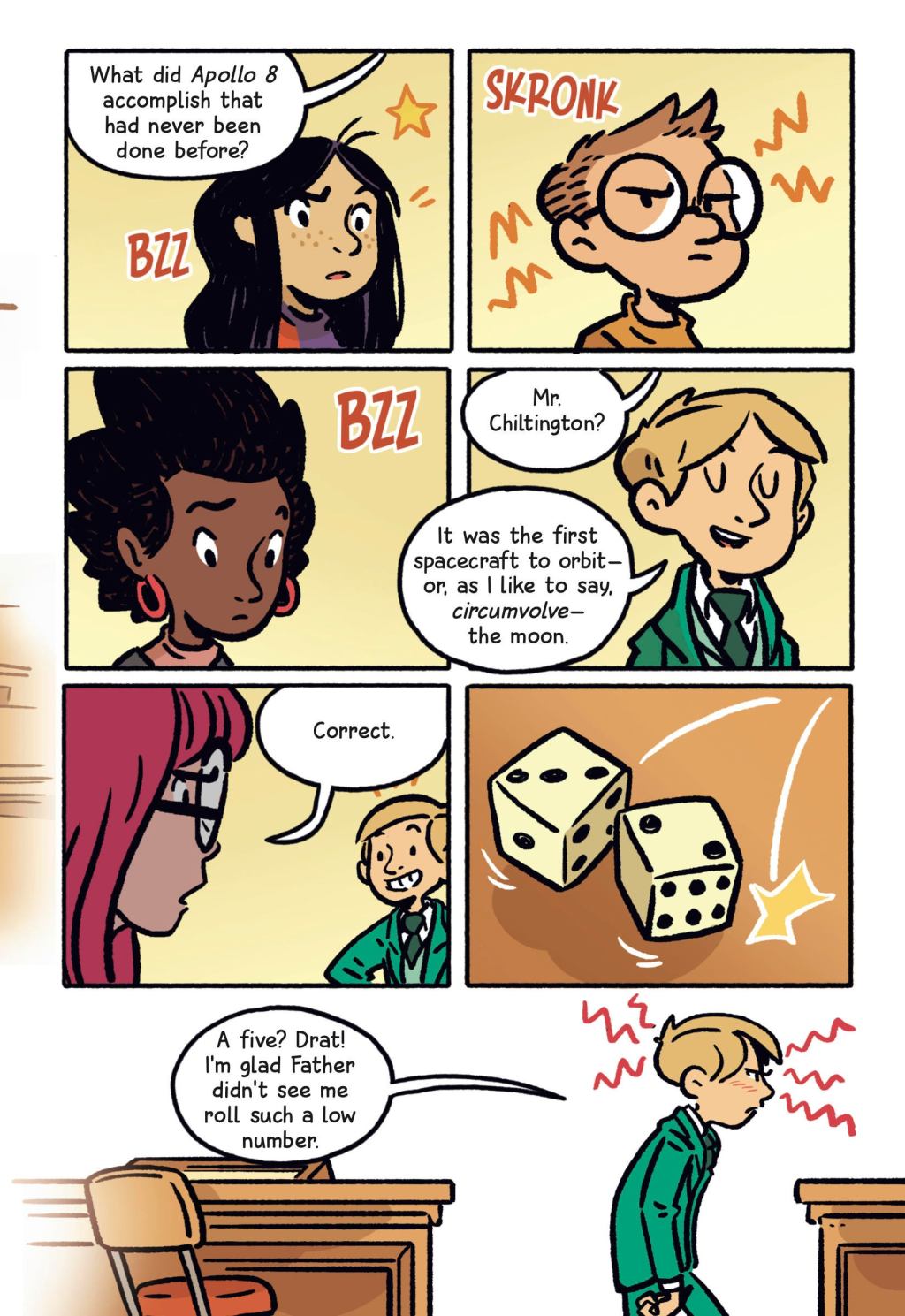 “In these pages, we get a taste of the competition to come,” Grabenstein told ComicBook.com. “Kyle Keeley versus Charles Chiltington. It’s a human-game-pieces version of one of Mr. Lemoncello’s most popular board games. But what’s up with all the antique trivia questions? Are they some kind of clue, perhaps? On page 63, we get a hint as to why Charles acts the way he does. (He has serious Daddy issues.) We also build him up as a true contender. As he reminds Kyle, Chiltingtons never lose.”