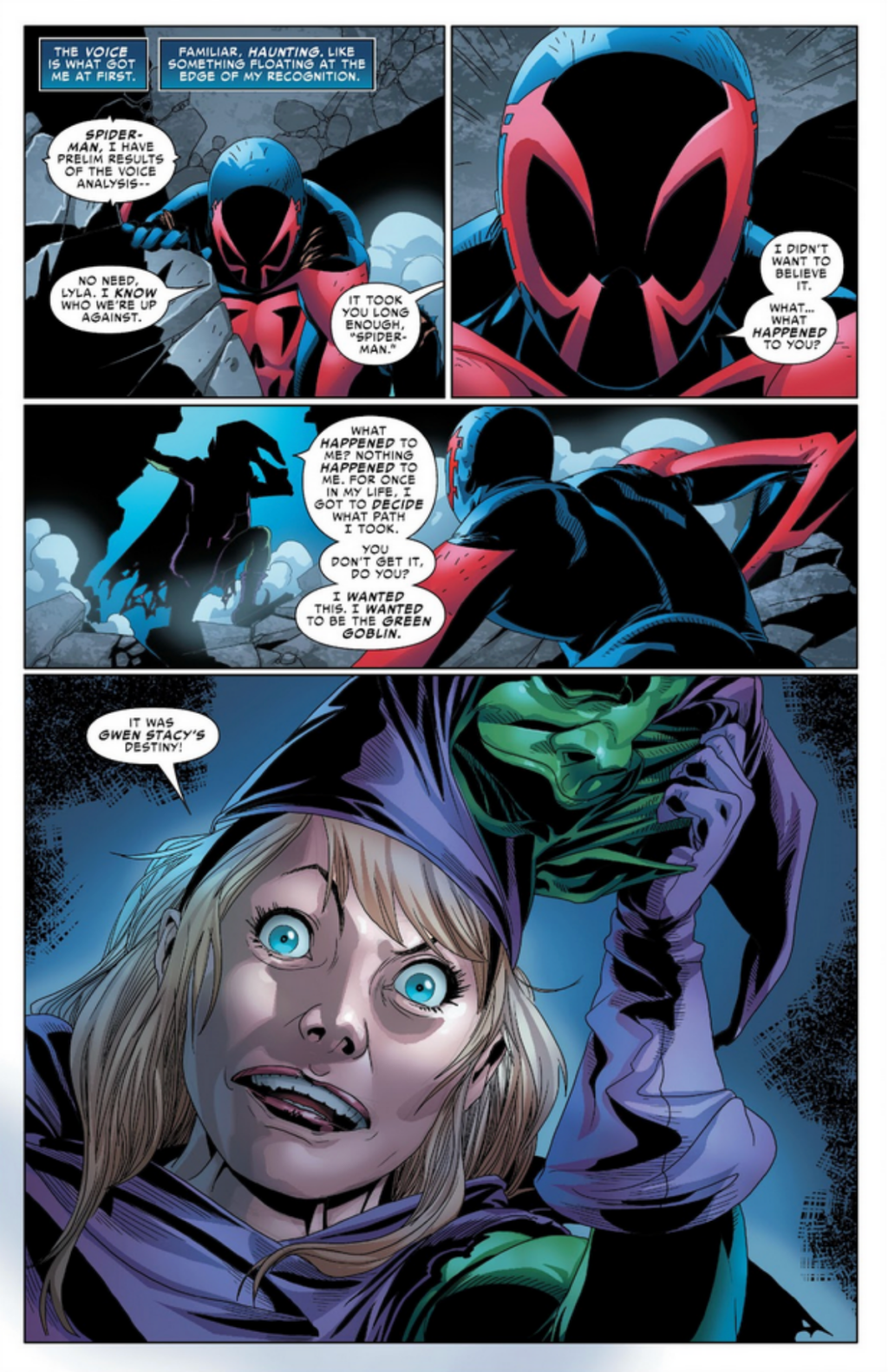 Web of Spider-Man unmasks the female goblin as the Gwen Stacy of another universe who decided to become the Green Goblin. “I wanted this. I wanted to be the Green Goblin,” Gwen tells Miguel. “It was Gwen Stacy’s destiny!” Before Gwen Goblin can reveal her master plan, she’s attacked by Aña Corazón, a.k.a. Araña, and escapes with a captured Miguel.