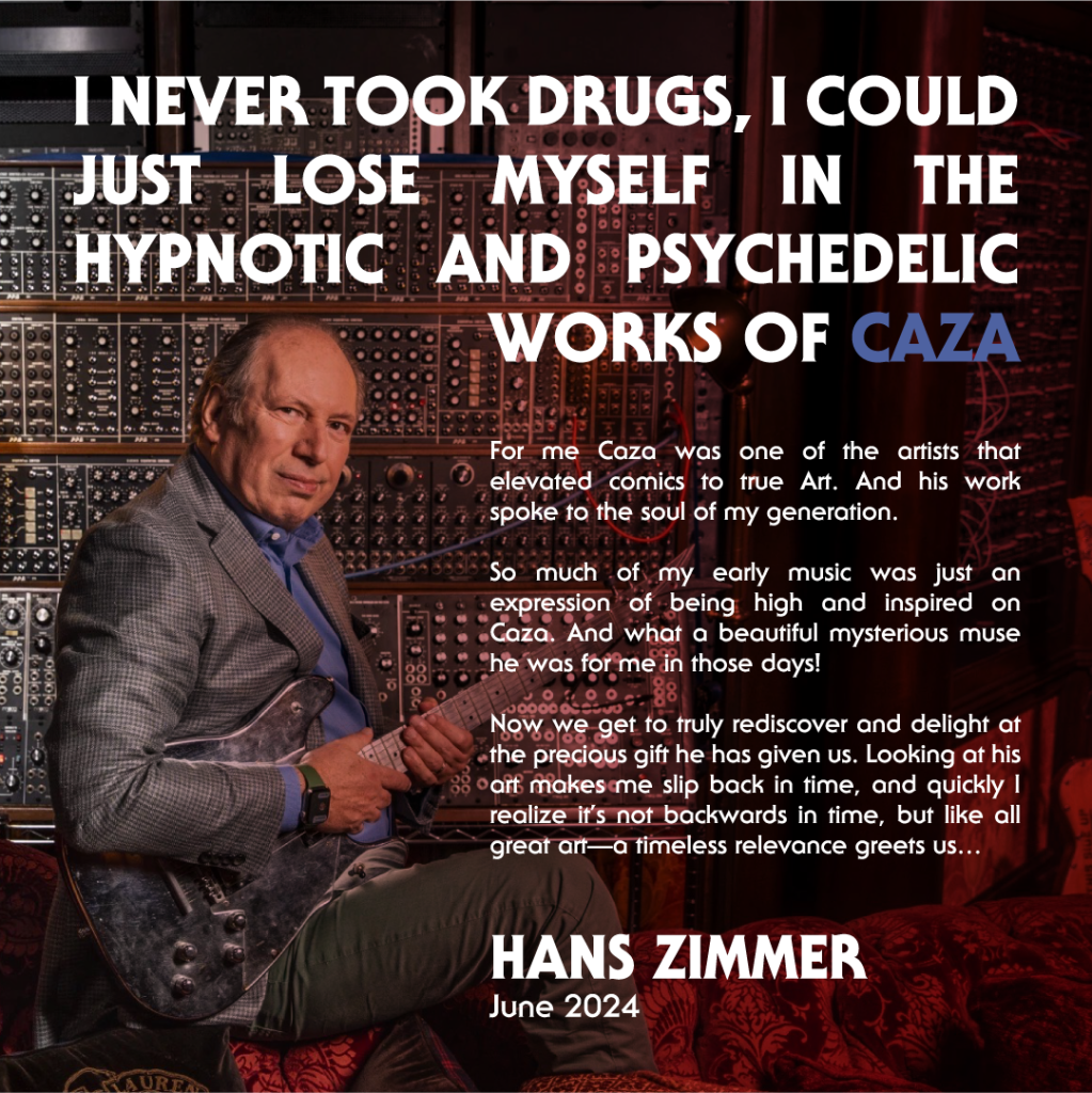 “I never took drugs. I could just lose myself in the hypnotic and psychedelic works of Caza,” Zimmer is quoted as saying on the crowdfunding campaign. “For me Caza was one of the artists that elevated comics to true Art. And his work spoke to the soul of my generation. So much of my early music was just an expression of being high and inspired on Caza. And what a beautiful mysterious muse he was for me in those days! Now we get to truly rediscover and delight at the precious gift he has given us. Looking at his art makes me slip back in time, and quickly I realize it’s not backwards in time, but like all great art—a timeless relevance greets us…”