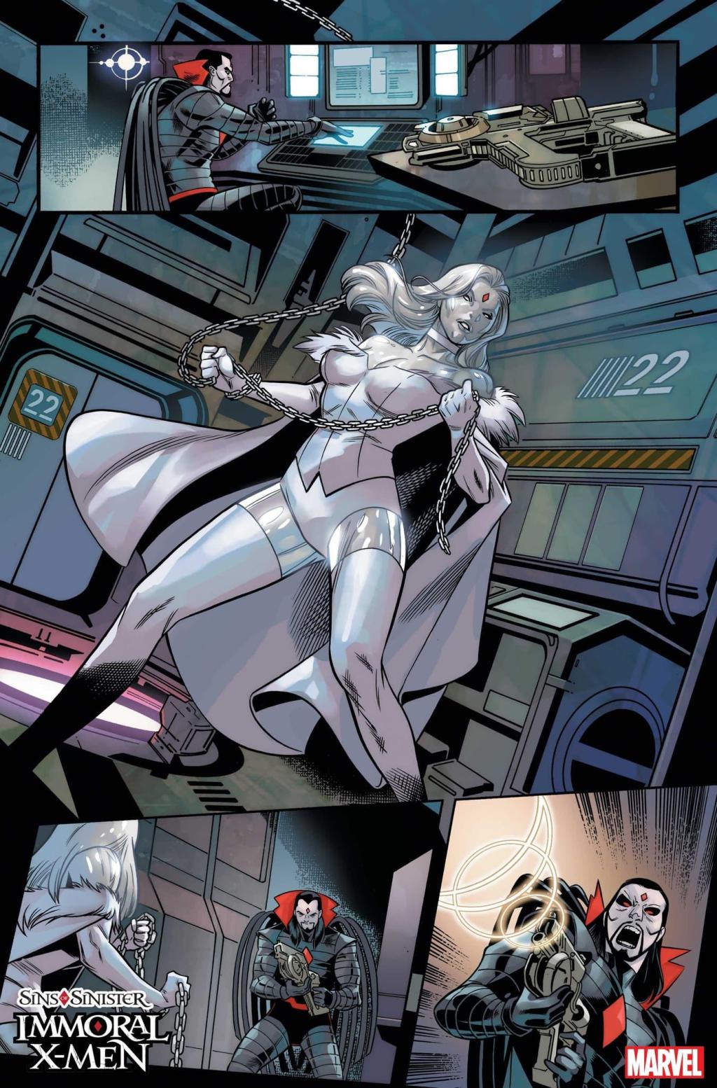 “In Immoral X-Men #1, a decade has passed since Mister Sinister successfully enacted his plan. Now, the X-Men exist in a world that adores and respects them… and yet, they still yearn to crush it. In the meantime, Emma Frost will vent her frustrations by taking a few minutes out to crush Mister Sinister,” a description of Immoral X-Men #1 reads.ย