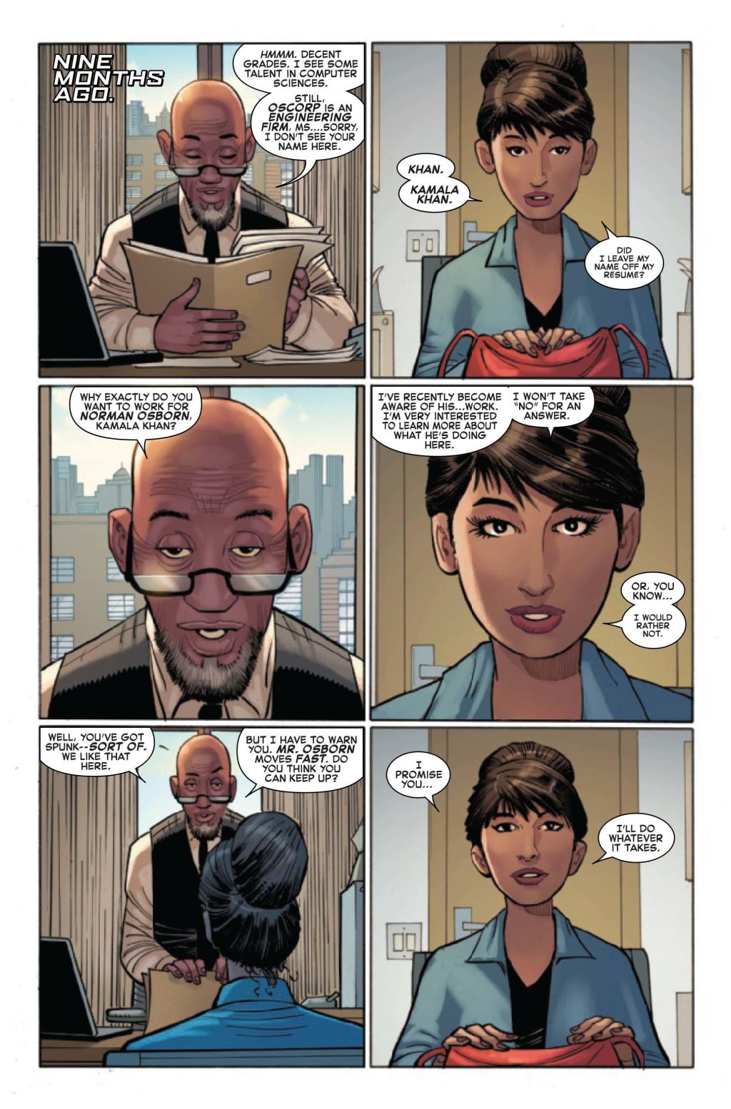 Marvel released a preview of The Amazing Spider-Man #26 by Zeb Wells, John Romita Jr., Scott Hanna, and Marcio Menyz. It takes readers back nine months ago when Ms. Marvel โ in her civilian identity as Kamala Khan โ goes to interview for a job working for Norman Osborn. Ms. Marvel has been a supporting character in Amazing Spider-Man, but she will obviously get a larger profile after she dies helping Spider-Man fight Rabin the Emissary.