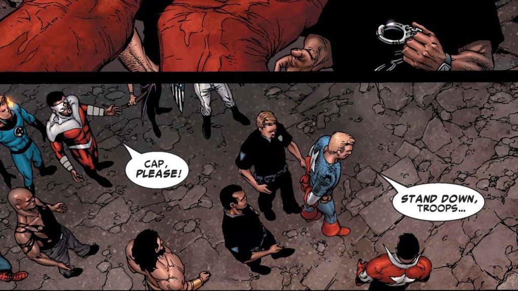 The Civil War story arc was one of Marvel’s biggest events to span comic books. It saw a large number of Marvel heroes who were once allies battle each other over differing ideals. It culminates into one final fight between Iron Man and Captain America. Just as Captain America is about to deliver the final blow, he is pulled off of Iron Man and forced to surrender. This is one of the deepest defeats that Captain America has ever faced and ends with him being assassinated. Captain America has lost a number of his battles, but his loss in Civil War is definitely a landmark event for the character, both because of his shocking death, but because we see Captain America surrender, which is seriously a punch in the gut.