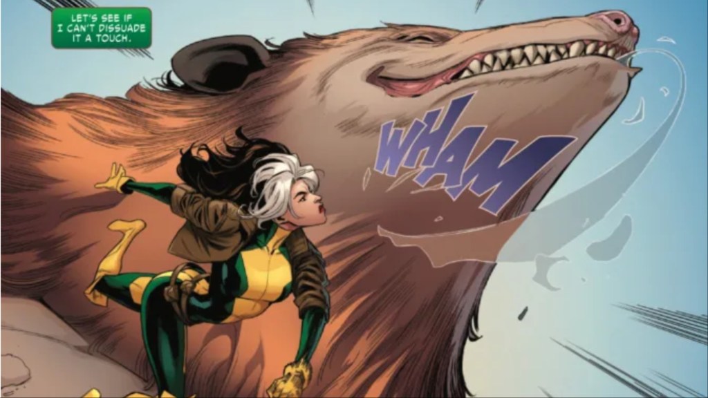 This story starts out wonderfully, dropping readers into a battle between the X-Men and a giant monster. It’s an exciting little fight that shows Rogue as a leader, while reminding readers of her past. This is a great way to start a new issue. New readers might not know that Rogue is a leader (especially if they’re X-Men ’97 fans but haven’t picked up the comics in a while), so showing her in the field and how proficient she is in command is a great thing to show. There’s a little tease of which way the story is going to go in the first few pages, and the whole sequence is extremely entertaining. Schultz does a bang-up job of showing why Rogue is one of the X-Men’s best superheroines, and she nails the character’s individual voice and where she is as a character right now. Even if you don’t know a lot about her in the past few years, this story will still work for you.