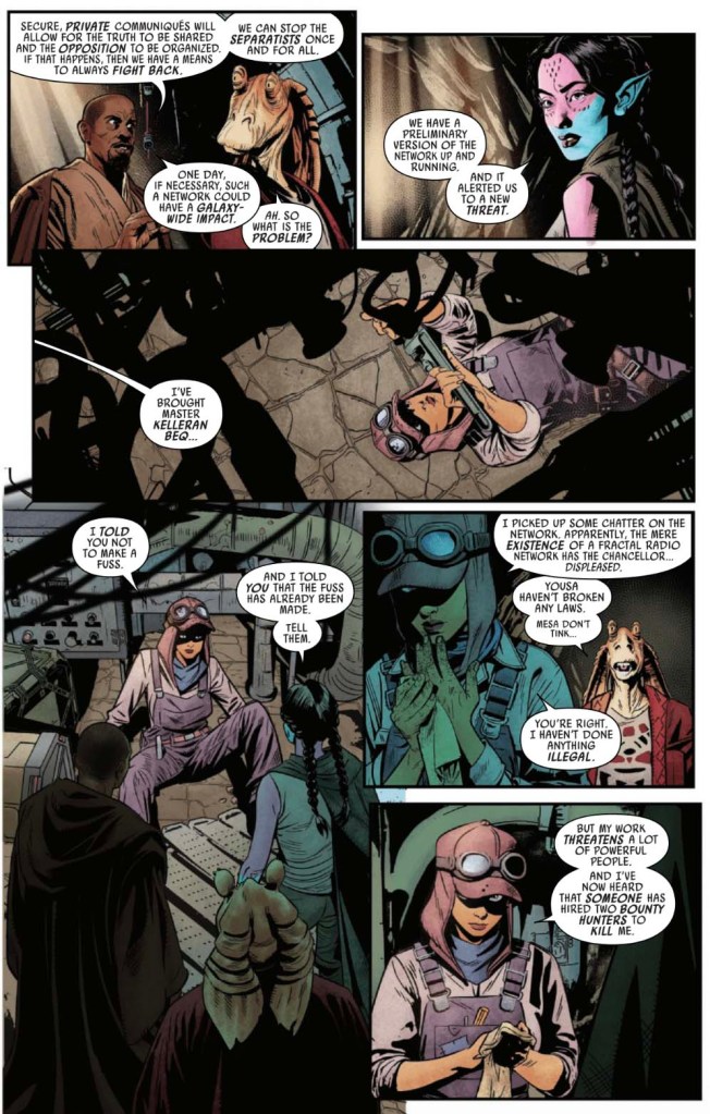Like much of what we see from Jar Jar in the movies, in the book he mostly seems to luck his way into being useful and even then, somewhat reluctantly. His biggest role in all of this is that he ends up taking over piloting duties to escape bounty hunters only when the actual pilot is injured and even then, he largely needs to be told what to do. Things take a more potentially interesting turn when Jar Jar meets with the Chancellor and starts to put two and two together for himself. As the issue closes, we see Jar Jar finally do something decisive, taking the big step to begin putting together what will eventually become the Rebellion. It’s in those final pages that we really get to see the potential in what Jar Jar will actually do, but the issue feels more like a bit of fan service and filler to set up for it. The effect is more of a retcon of sorts, but never fully absolves Jar Jar of being a key player in Palpatine’s rise. It’s just a nice little asterisk in the story to show that he did, actually, realize he made a mistake and tried to fix things as best he knew how.
