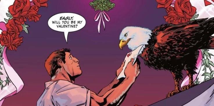 In the final page of the issue, we discover who this character is โ Eagly, his trusted eagle sidekick. Peacemaker then asks Eagly to be his valentine, and recites a love-themed version of “My Country, ‘Tis of Thee” to the bird.