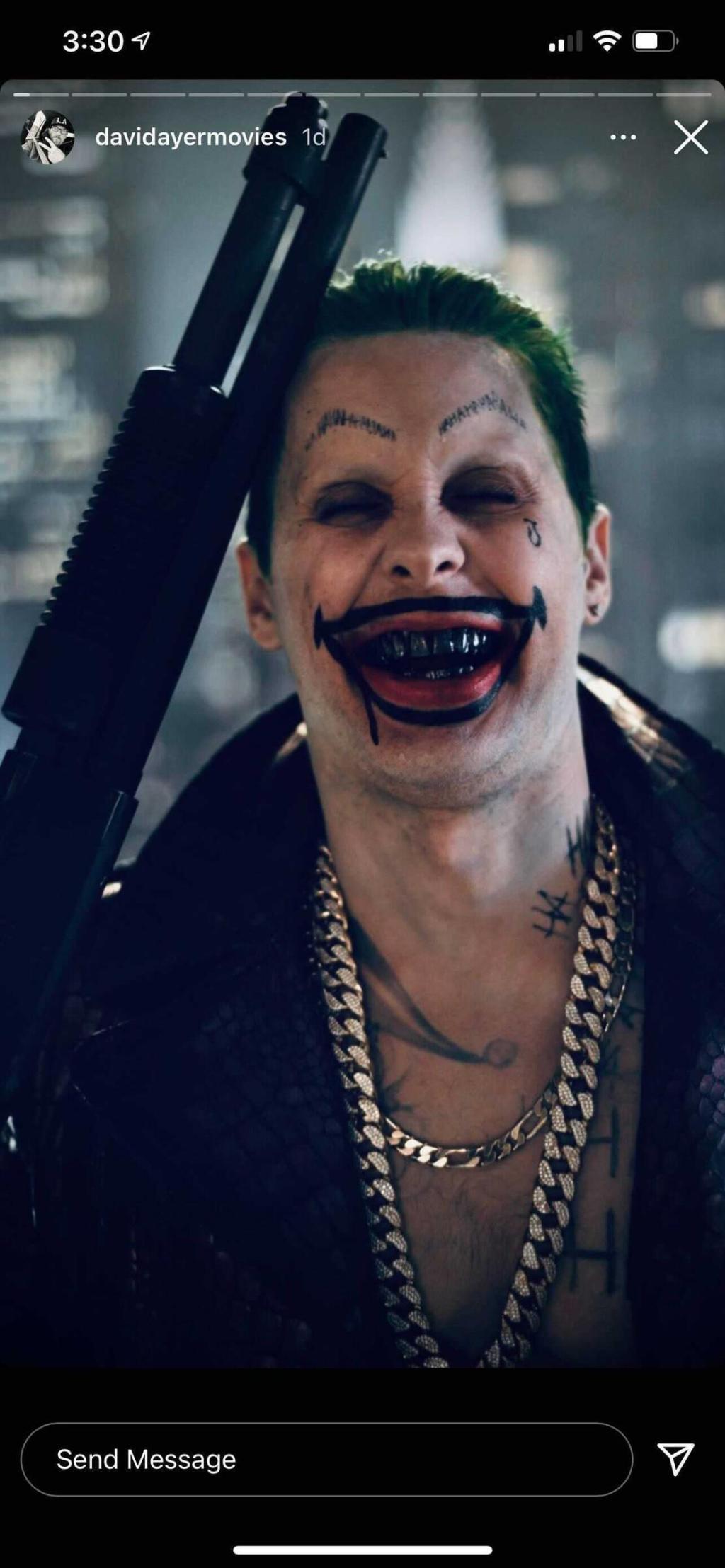 This week, Ayer shared a photo of Jared Leto’s Joker to his Instagram story. We’ve seen different costumes and makeup designs for Leto’s character over the years, but this might be the wildest one yet. This version of Joker features a black smile drawn or tattooed (probably tattooed) across his face. Perhaps even creepier are Joker’s eyebrows, which are just tattoos reading “HAHAHA” in place of any hair. You can take a look below!