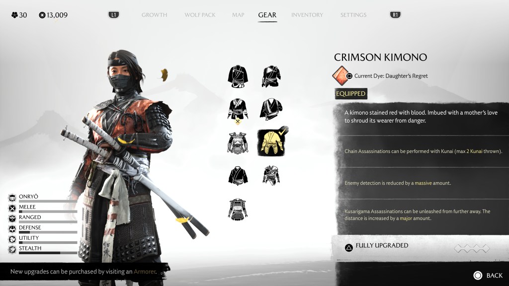 The Crimson Kimono helps sneaking because of how well it keeps the player hidden. When fully upgraded, it allows players to get an extra two assassinations by throwing kunai. Combining this perk with either of the Chain Assassination skills in the Assassination part of the skill tree means it is possible to take out five foes in one sequence. (That’s also enough to fully charge Onyro’s Howl, which can lead to another free kill or two.) These ones killed with kunai can be somewhat far away, too, which gives this build a surprising amount of range.